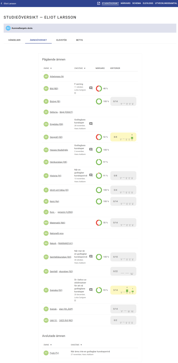 Efter detta hamnar man på fliken Ämnesöversikt för den elev man valde. Därmed har man kommit in på elevens: Studieöversikt.