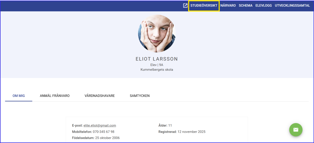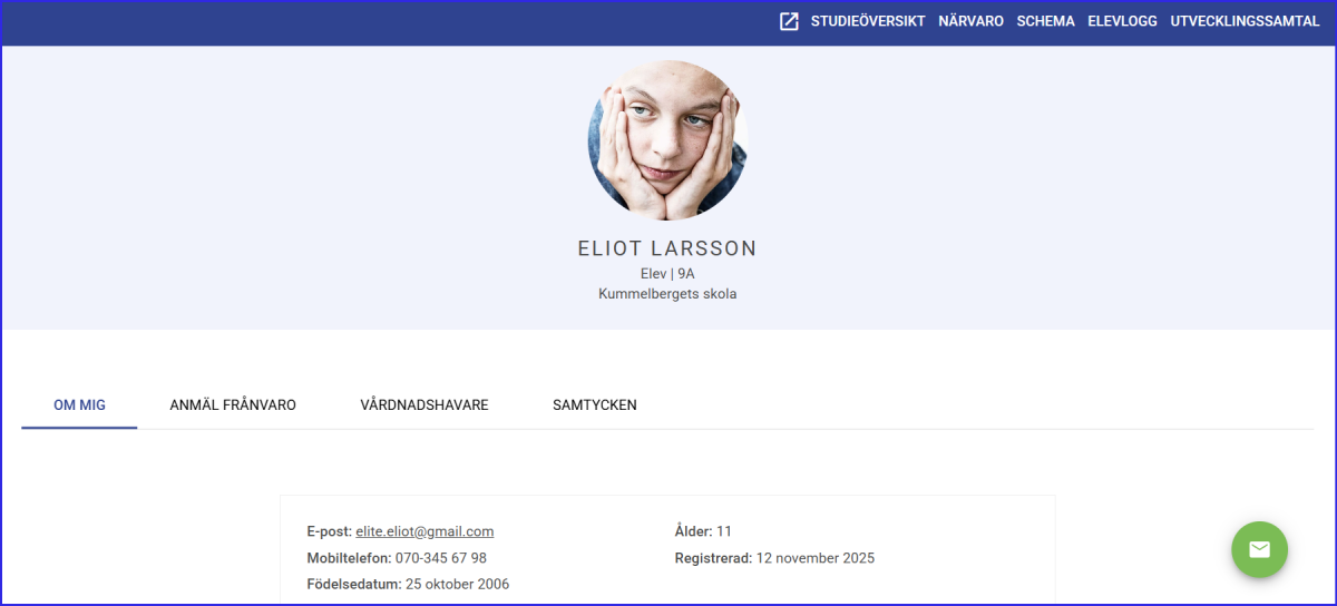 Efter detta hamnar man på Profilsidan för den elev man valde.