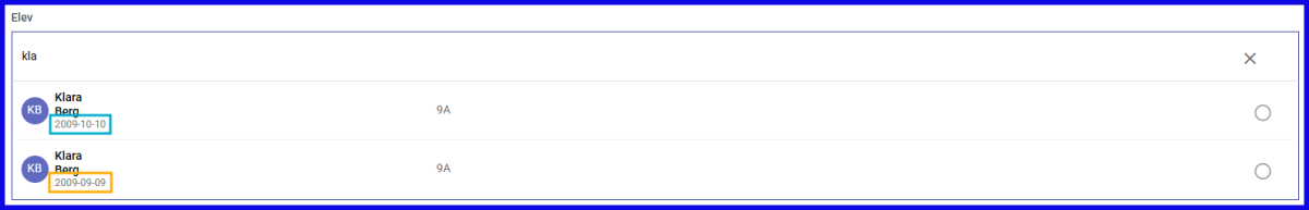 Om man undervisar Elever/Studenter som har samma namn? Då visar vi födelsedatumet under deras namn.
