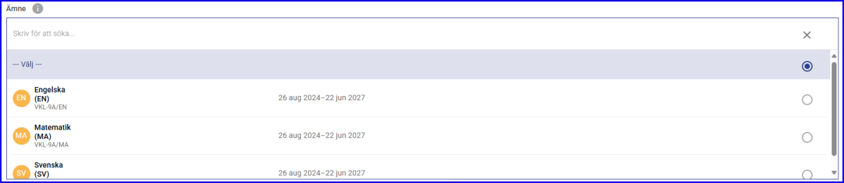 Val av Ämne fungerar på samma sätt som när man väljer Elev. Dvs. Enligt följande två varianter.