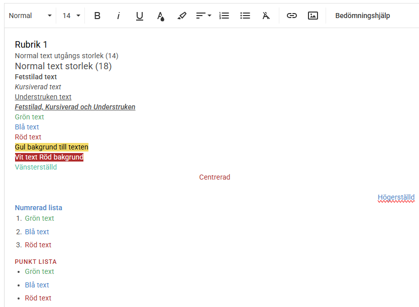 <h3>Rubrik 1</h3>Normal text utgångs storlek (14)<br><span style="font-size: 18px;">Normal text storlek (18)</span><br><span style="font-size: 14px;"><strong>Fetstilad text</strong></span><br><span style="font-size: 14px;"><em>Kursiverad text</em></span><br><span style="font-size: 14px;"><u>Understruken text</u></span><br><span style="font-size: 14px;"><u><strong><em>Fetstilad, Kursiverad och Understruken</em></strong></u></span><br><span style="font-size: 14px; color: rgb(65, 168, 95);">Grön text</span><br><span style="color: rgb(44, 130, 201);">Blå text</span><br><span style="color: rgb(184, 49, 47);">Röd text</span><br><span style="color: rgb(0, 0, 0); background-color: rgb(247, 218, 100);">Gul bakgrund till texten</span><br><span style="color: rgb(255, 255, 255); background-color: rgb(184, 49, 47);">Vit text Röd bakgrund</span><br><span style="color: rgb(26, 188, 156);">Vänsterställd</span><div style="text-align: center;"><span style="color: rgb(184, 49, 47);">Centrerad</span></div><div style="text-align: right;"><span style="color: rgb(44, 130, 201);">Högerställd</span></div><h4><span style="color: rgb(44, 130, 201);">Numrerad lista</span></h4><ol><li><span style="color: rgb(44, 130, 201);"><span style="font-size: 14px; color: rgb(65, 168, 95);">Grön text</span></span></li><li><span style="color: rgb(44, 130, 201);"><span style="color: rgb(44, 130, 201);">Blå text</span></span></li><li><span style="color: rgb(44, 130, 201);"><span style="color: rgb(184, 49, 47);">Röd text</span></span></li></ol><h5><span style="color: rgb(44, 130, 201);"><span style="color: rgb(184, 49, 47);">Punkt lista</span></span></h5><ul><li><span style="color: rgb(44, 130, 201);"><span style="font-size: 14px; color: rgb(65, 168, 95);">Grön text</span></span></li><li><span style="color: rgb(44, 130, 201);"><span style="color: rgb(44, 130, 201);">Blå text</span></span></li><li><span style="color: rgb(44, 130, 201);"><span style="color: rgb(184, 49, 47);">Röd text</span></span></li></ul>